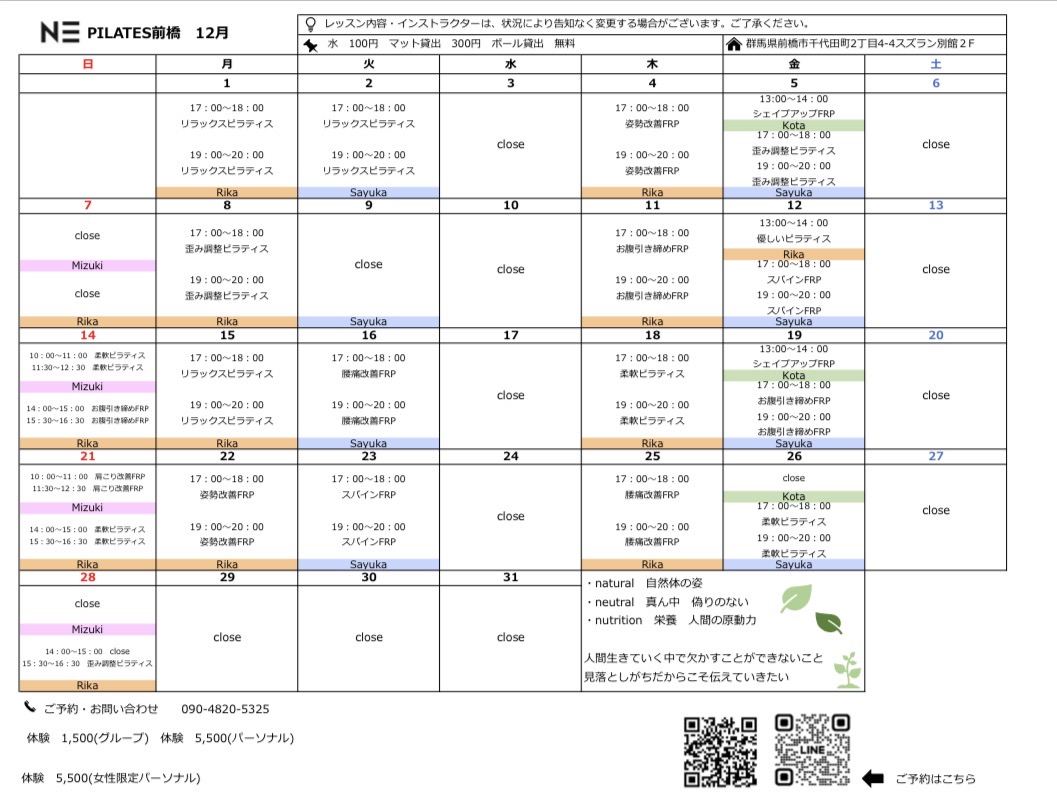 12月 グループ ピラティス予定表になります。